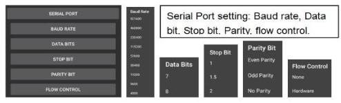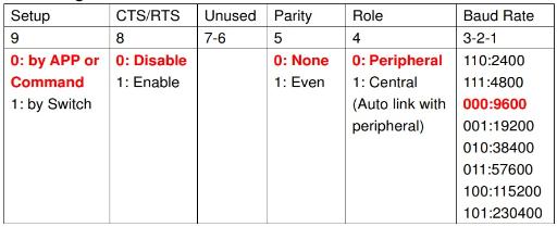 bit 0: Parity (0: NONE 1: EVEN) bit 1: Flow control (0: Disabled 1: Enabled) (for RS232 model Only) bit 2: N/A bit 3: Port Type (0: RS485 1: RS422) (Available on RS485 model only) bit 4: BLE Role (0: Peripheral 1: Central) (indication Only) bit 5: ControlSet (0: set by APP or command 1: set by 9P switch) (indication Only)