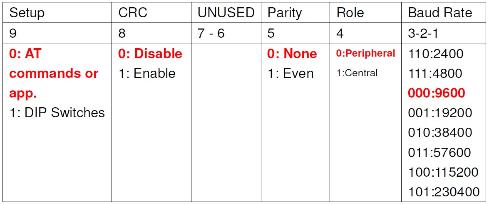 bit 0: Parity (0: NONE 1: EVEN) bit 1: Flow control (0: Disabled 1: Enabled) (for RS232 model Only) bit 2: N/A bit 3: Port Type (0: RS485 1: RS422) (Available on RS485 model only) bit 4: BLE Role (0: Peripheral 1: Central) (indication Only) bit 5: ControlSet (0: set by APP or command 1: set by 9P switch) (indication Only)